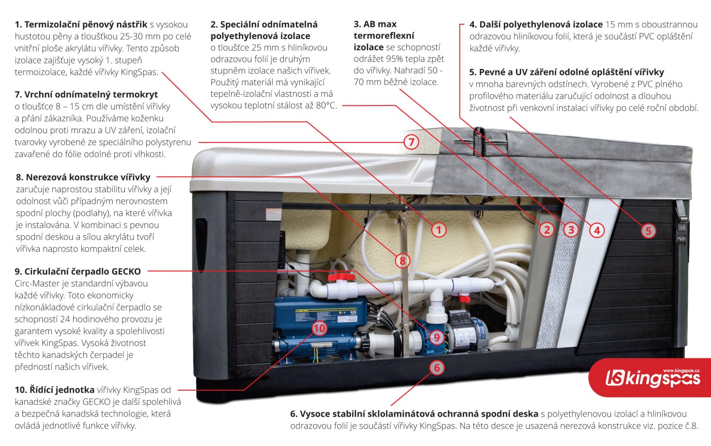 • Speciální termoizolace tl. 25 mm s odrazovou fólií mezi obložením a vnitřní technologií vířivky